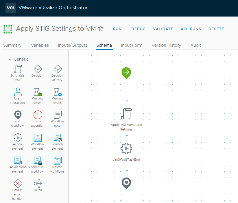 A vRealize Orchestrator package containing the complete workflow and resource file can be downloaded here: vRealize Orchestrator Package for Applying DISA STIG Settings to Virtual Machines