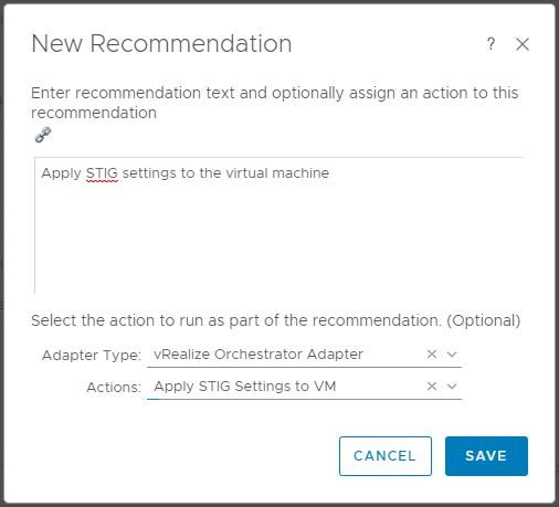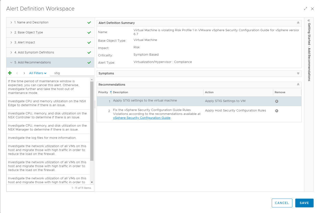 Since we are creating a new recommendation in this example, we now need to assign this recommendation to an alert. To do this, click on Alert Definitions under the Alert Settings. Either create a new alert definition or select an existing definition to edit. While I recommend creating a custom alert specific to the DoD STIG checks, for this example, I will assign our new recommendation to the existing alert Virtual Machine is violating Risk Profile 1 in VMware vSphere Security Configuration Guide for vSphere version 6.7. To accomplish this, we will select the alert from the list of alerts and click on the pencil icon at the top of the list to edit the alert definition. In the resulting dialog, we will select Add Recommendations from the left side. Filter the list of recommendations by searching for “stig”, and then drag/drop the recommendation from the left side to the Recommendations section on the right side of the Alert Definition Workspace ensuring that our recommendation is the first in the list. Click the SAVE button to update the alert definition.