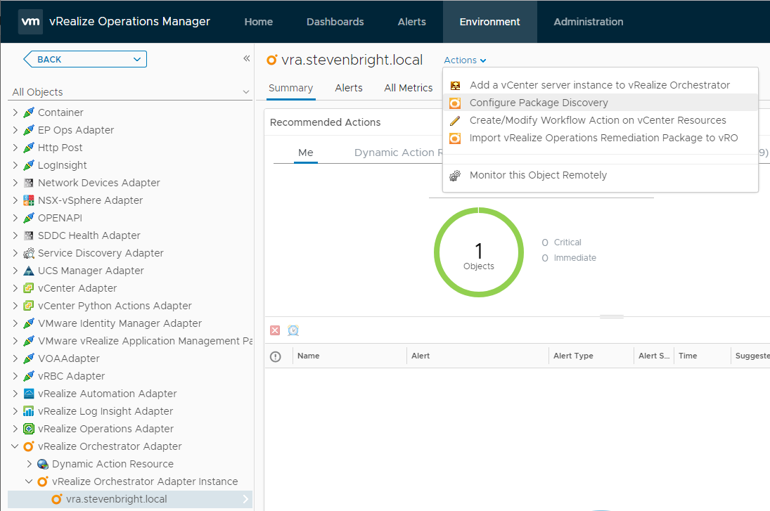 Next, we need to configure the vRealize Operations Management Pack for vRealize Orchestrator to discovery our workflows. This is accomplished by configuring the discovery settings of the management pack to include the vRealize Orchestrator package that contains our workflow. To modify the list of packages to discover, with the vRealize Operations interface select the Environment tab, then in the left select All Objects. Next, you will need to expand vRealize Orchestrator Adapter -> vRealize Orchestrator Adapter Instances object on the left side and select your instance of vRealize Orchestrator that you configured when you installed the management pack. On the resulting details window, select the Action menu from the top and select Configure Package Discovery.