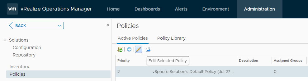 The final step is to configure our vRealize Orchestrator policy so that the alert is configured to execute the automation. To do this, select Administration from the top of the window, then select Policies from the left side of the window. Select the policy that you would like to apply this automation to, then click the pencil icon at the top of the list to edit the policy.