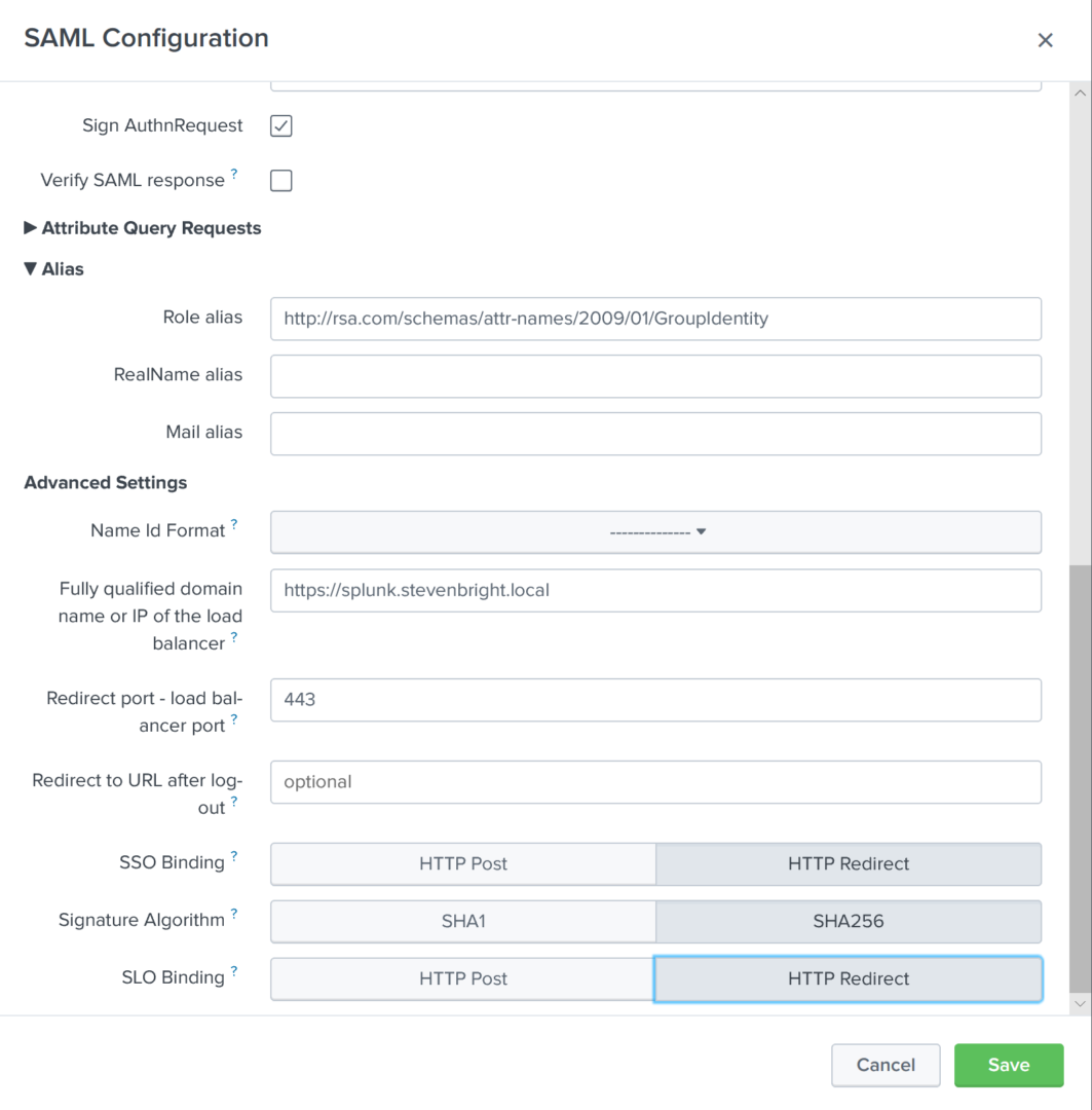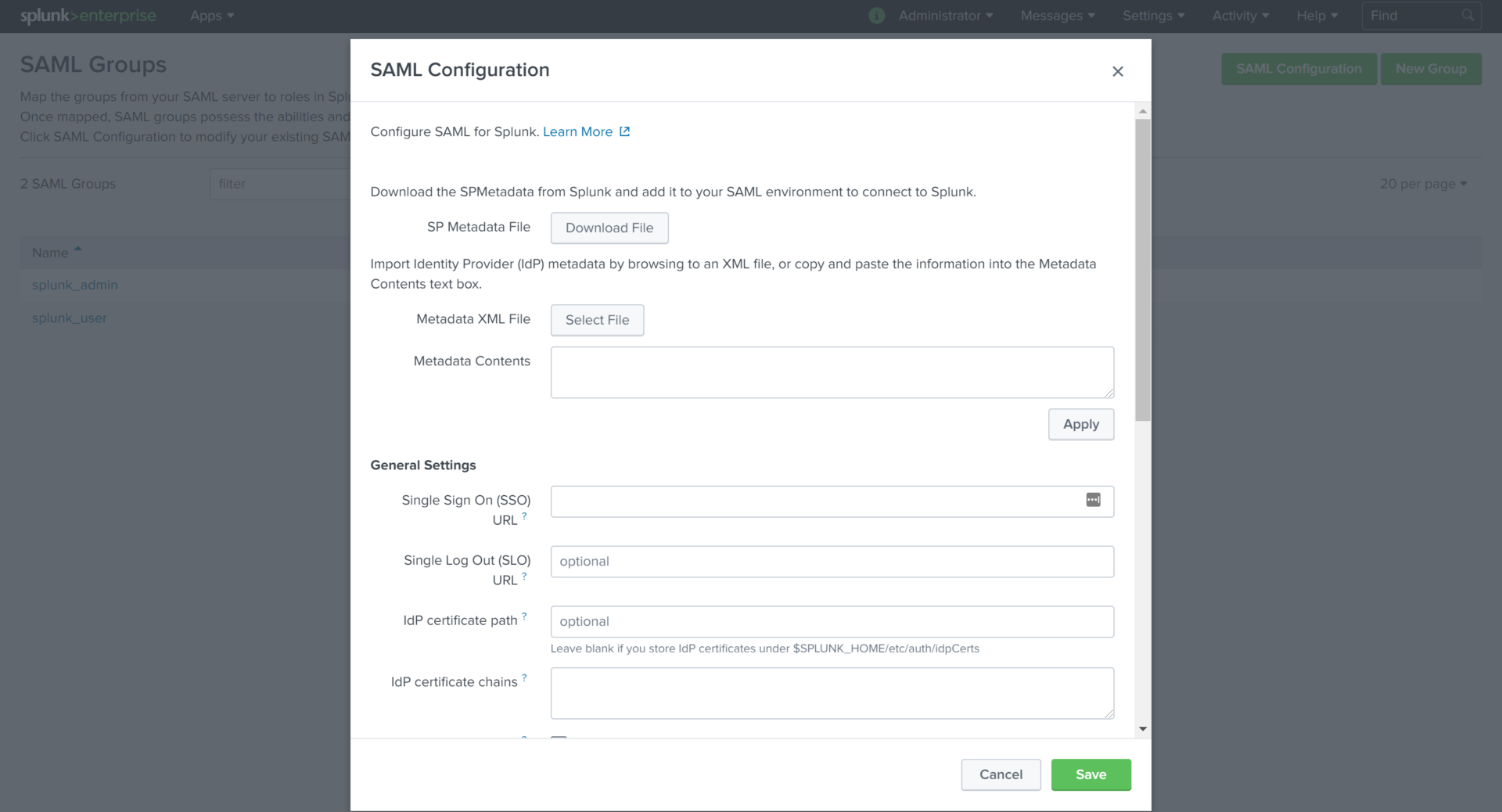 Click the Save button to save the SAML Configuration to Splunk Enterprise.