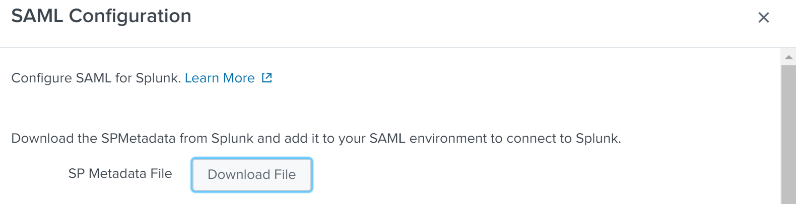 Now that we have configured Splunk Enterprise to utilize SAML Authentication, we need to download the SAML Service Provider metadata XML file from Splunk Enterprise. We will later import this file into the VMware vSphere PSC. To download the metadata XML, click on the green SAML Configuration button at the top right of the SAML Groups page. Then click on the Download File button next to the SP Metadata File label.
