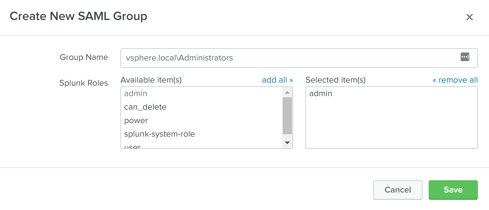 In this example, we will configure one SAML Group for use in assigning Splunk Enterprise roles. We will add the “vsphere.local\Administrators” group into Splunk Enterprise and configure it to have the “admin” role. To create the group, click the New Group button on the SAML Groups page. Enter “vsphere.local\Administrators” into the Group Name field, then click on “admin” in the Available item(s) list next to Splunk Roles to add the “admin” role to the Selected item(s) list. Click the Save button to add the SAML group.
