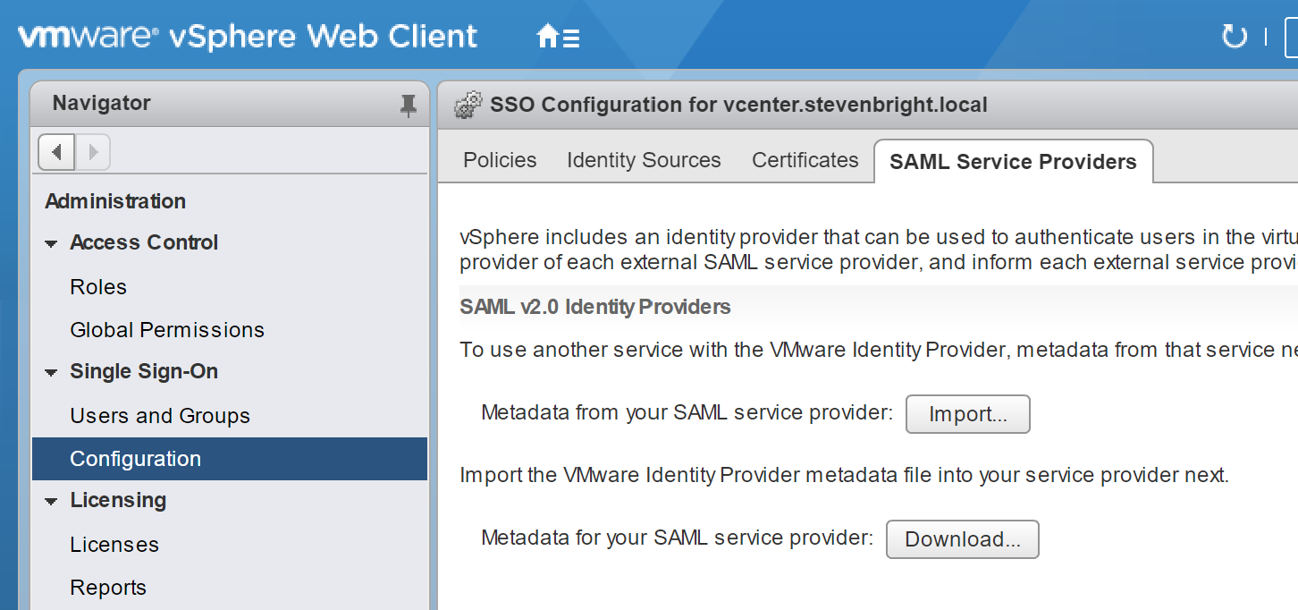 Next, you will need to click on the Download… button next to the text “Metadata for your SAML service provider:” text. You’ll be prompted to download a file with the name “vsphere.local.xml” (assuming your vSphere SSO domain is using the default name).