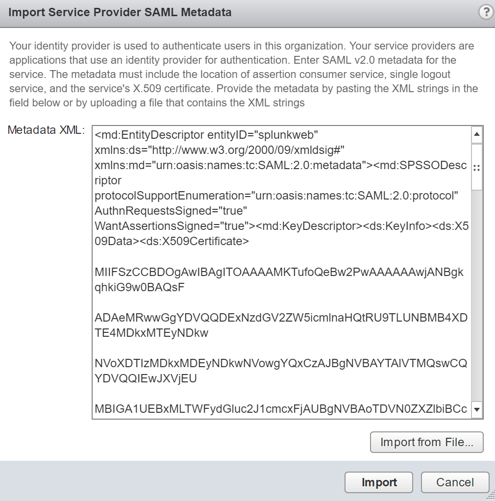 Next click the Import… button to the right of “Metadata from your SAML service provider:”. On the resulting “Import Service Provider SAML Metadata” dialog box, click the Import from File… button. Select the “SPMetadata.xml” file that you just downloaded from your Splunk Enterprise deployment. The Metadata XML box should now contain the contents of the XML file.