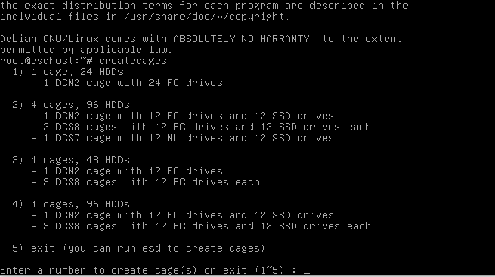 After the VMs complete their boot processes, open a console session to the ESD node. Log into the node using the username root and the password root. Next, we initialize the ESD’s storage configuration by typing the command createcages and selecting from one of the menu options provided.
