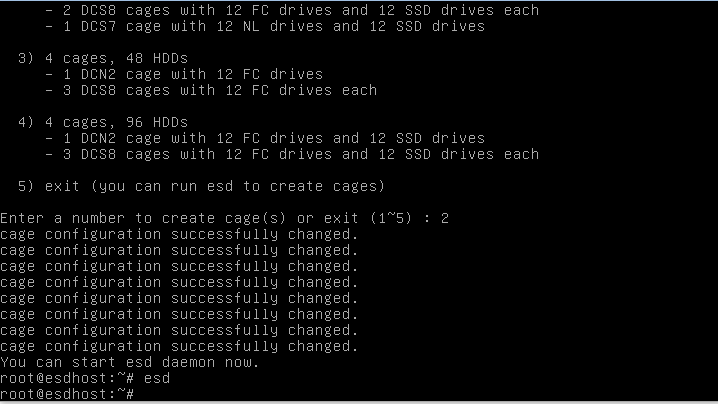 Because I want to have all three drive types (NL, FC, and SSD) in my instance of the simulator, I select option 2. Creation of the cages happens fast, and when complete, you will see several lines on the console stating, “Cage configuration successfully changed.” Next, we start the ESD daemon by executing the command esd. Executing the command will not result in any additional output, so do not be alarmed if it seems like nothing has happened.