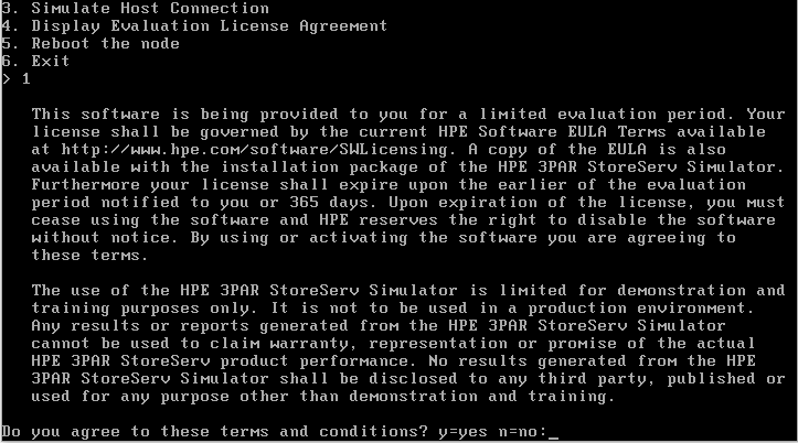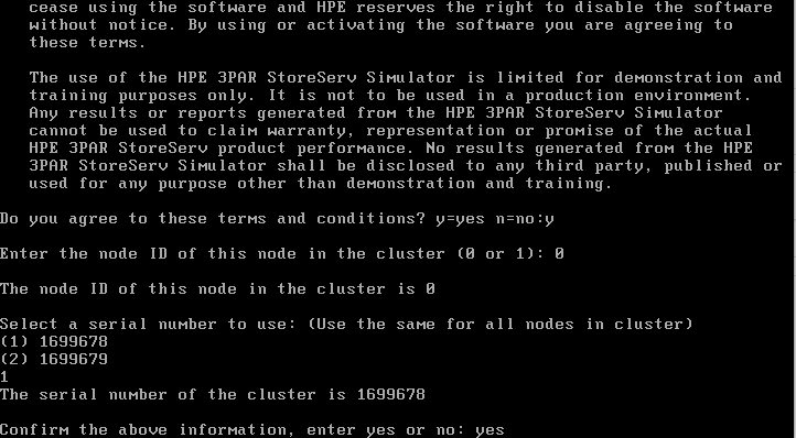 After agreeing to the terms and conditions, the cluster node will prompt us for a “node ID.” Since this is the first node, enter 0. Next, the cluster node will prompt you to select one of two serial numbers. For our purposes, select the first option 1699678. If you deploy a second simulator in the future to test the Remote Copy feature, select the second serial number when configuring that instance so that each device will have a separate serial. Finally, enter yes at the prompt to “Confirm the above information.”