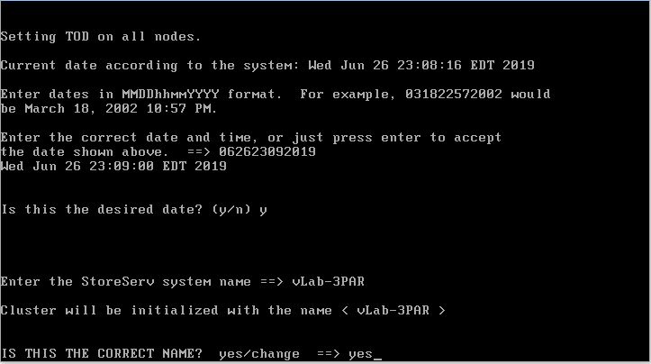 The OOTB process next asks us to confirm the date and time. If the value is correct, just hit the Enter key to continue. In my case, the time was slightly off, so I enter a new value before pressing Enter. After confirming the date and time, the OOTB process will request a system name. For this walkthrough, we use vLab-3PAR. We then input yes to confirm the cluster name.