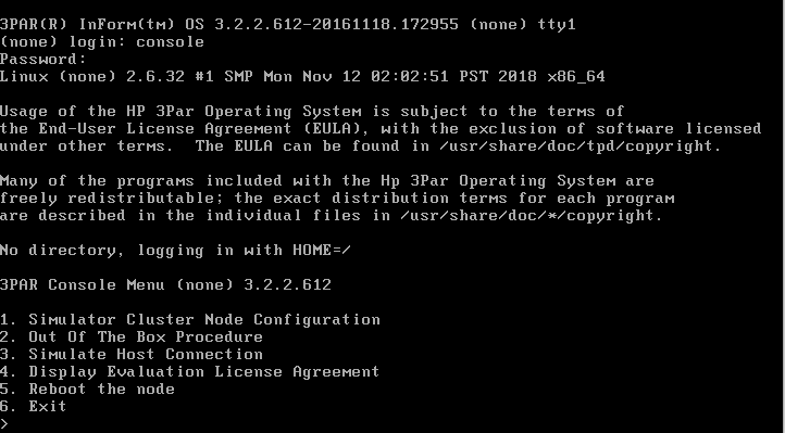 Now that we are finished configuring the ESD node, we need to configure the management cluster nodes. Open a console session to the first node (vLab-3PAR-Node0), and log in with the username console and the password crH72mkr. Next, choose option number 1 titled “Simulator Cluster Node Configuration.”