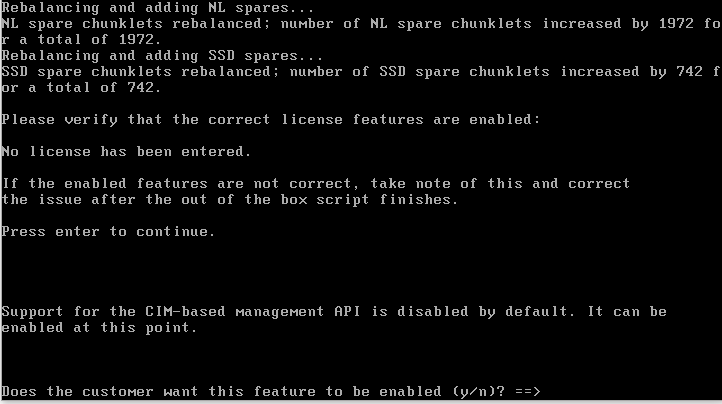 The initialization process continues for a while and then prompts us for input regarding spare chunklet allocation. We enter D for the default setting. Next, we are prompted to confirm the licensed featured. The list will be empty, so we press Enter to continue. For the next question regarding CIM Management, we enter Y.