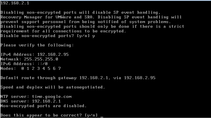 The next step is to provide the cluster with a management cluster IP address. In this exercise, we will only provide an IPv4 address. Thus we will select option 1) IPv4 Address and then enter a new IP address, subnet mask, and gateway for the cluster. When prompted, we enter auto for the interface speed and duplex. When prompted for an NTP Server, we enter time.google.com. Next up, we input our DNS servers. When prompted to “Disable non-encrypted ports,” we enter Y. We confirm the network settings and enter Y to continue.