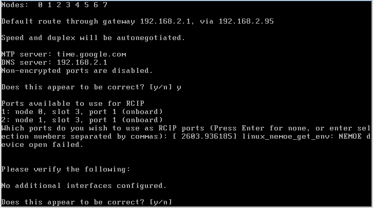 We are then prompted “Which ports do you wish to use as RCIP ports.” Since we aren’t planning to use the Remote Copy feature, we hit Enter to indicate “none” then Y when asked to confirm.
