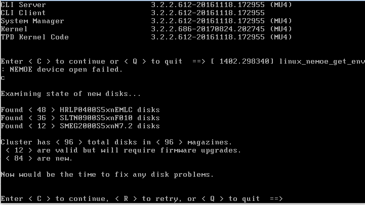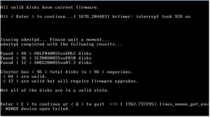 After confirming the disk counts, the process will prompt you to upgrade the firmware on your disks. We input C to continue the process as the simulated drives do not require firmware updates. We are then prompted to hit Enter to continue, and we do so. The cluster node will issue an “admitpd” command and provides us with the results. While the console states that some drives “will required firmware updates,” I confirmed that choosing to upgrade the firmware during the previous step does not change the outcome. We will enter C to continue.