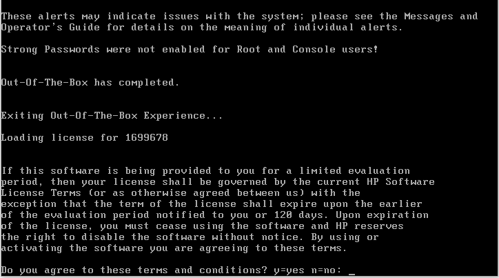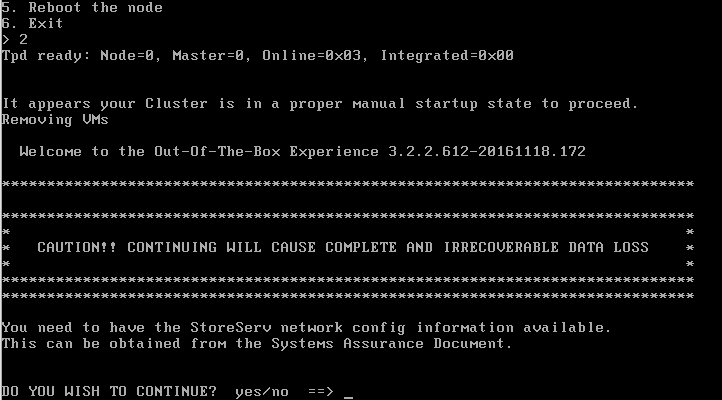 The last significant step in the process is for us to complete the “Out of the Box” (OOTB) procedure. This procedure is only executed once from the cluster node configured with the “Node ID” of 0. To start the process, we will log in to cluster node 0 (vLab-3PAR-Node0) using the username console and password crH72mkr. From the resulting menu, we select option 2 labeled “Out of the Box Procedure” to start the procedure. We are first greeted with a screen that states that the “Cluster is in a proper manual startup state to proceed” and asks if we wish to continue. We will enter yes to continue the process.
