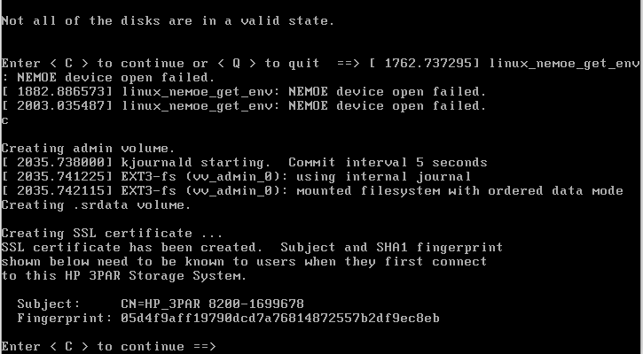 The OOTB process will create a new admin volume and SSL certificates. It then presents us with the Subject and Fingerprint of the certificate. We enter C to continue.