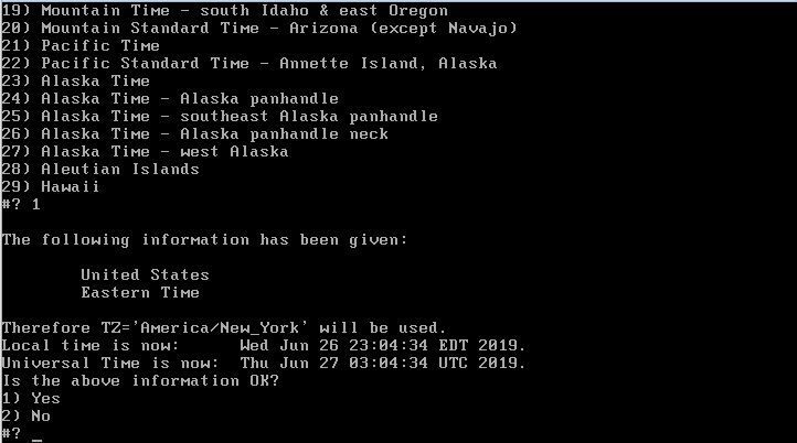 Next, the OOTB process tells is that the cluster has two nodes: “Node 0” and “Node 1”. We enter C into the prompt to continue the process. Next up, we are asked to specify a location to set the proper time zone rules. We choose option 2) Americas, option 49) United States, and then option 1) Eastern (most areas) which results in a timezone value of TZ=‘America/New_York’. We then choose 1) Yes to confirm that the information is OK. You should select the values appropriate to your location.