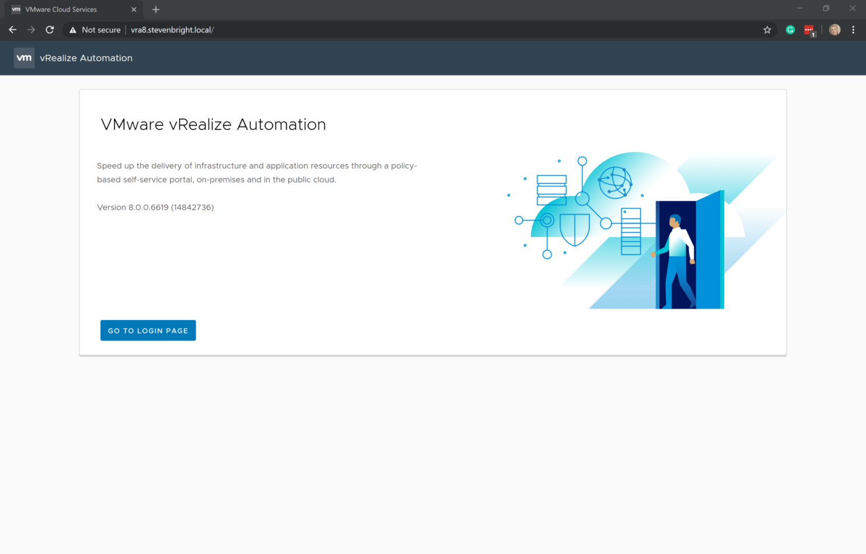 Up to this point, we haven’t touched our new vRealize Automation 8.0 environment. It’s now time to log in for the first time to begin the process configuring vRealize Automation 8.0 for use. To begin, access the URL of your new vRealize Automation 8.0 deployment. You’ll be greeted by a product splash screen that is accompanied by a button labeled Go To Login Page. Click this button to begin.