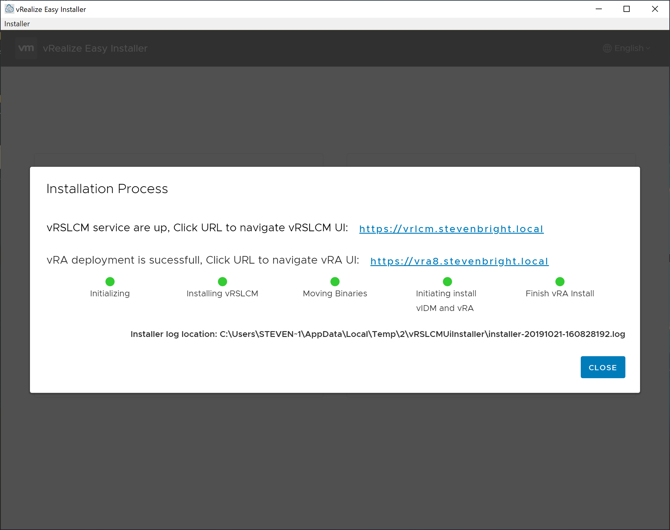 When the installation is complete, you are presented with a screen notifying you that the vRealize Suite Lifecycle Manager services are up, that vRealize Automation was deployed successfully, and providing you with the URL to access both web interfaces.