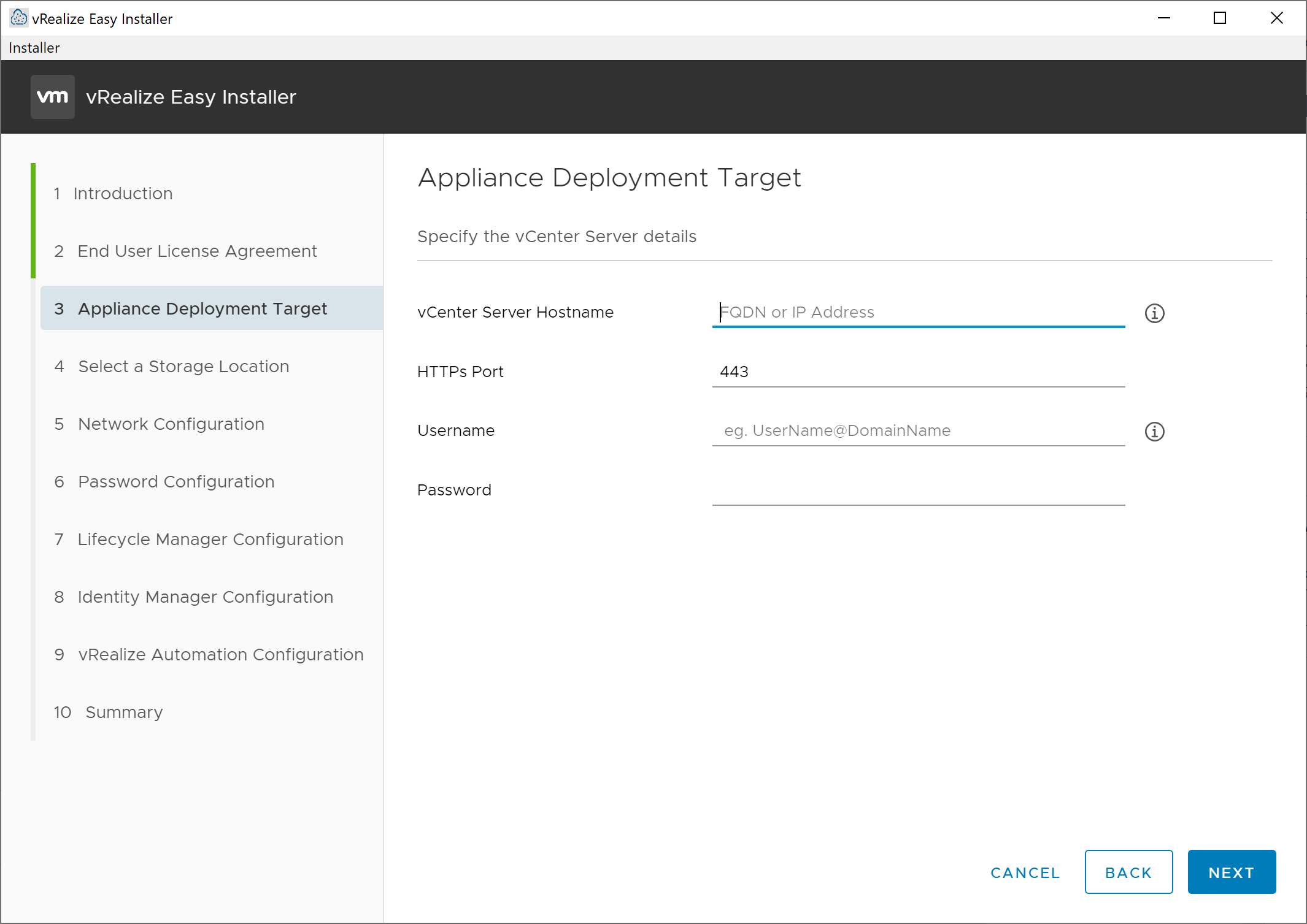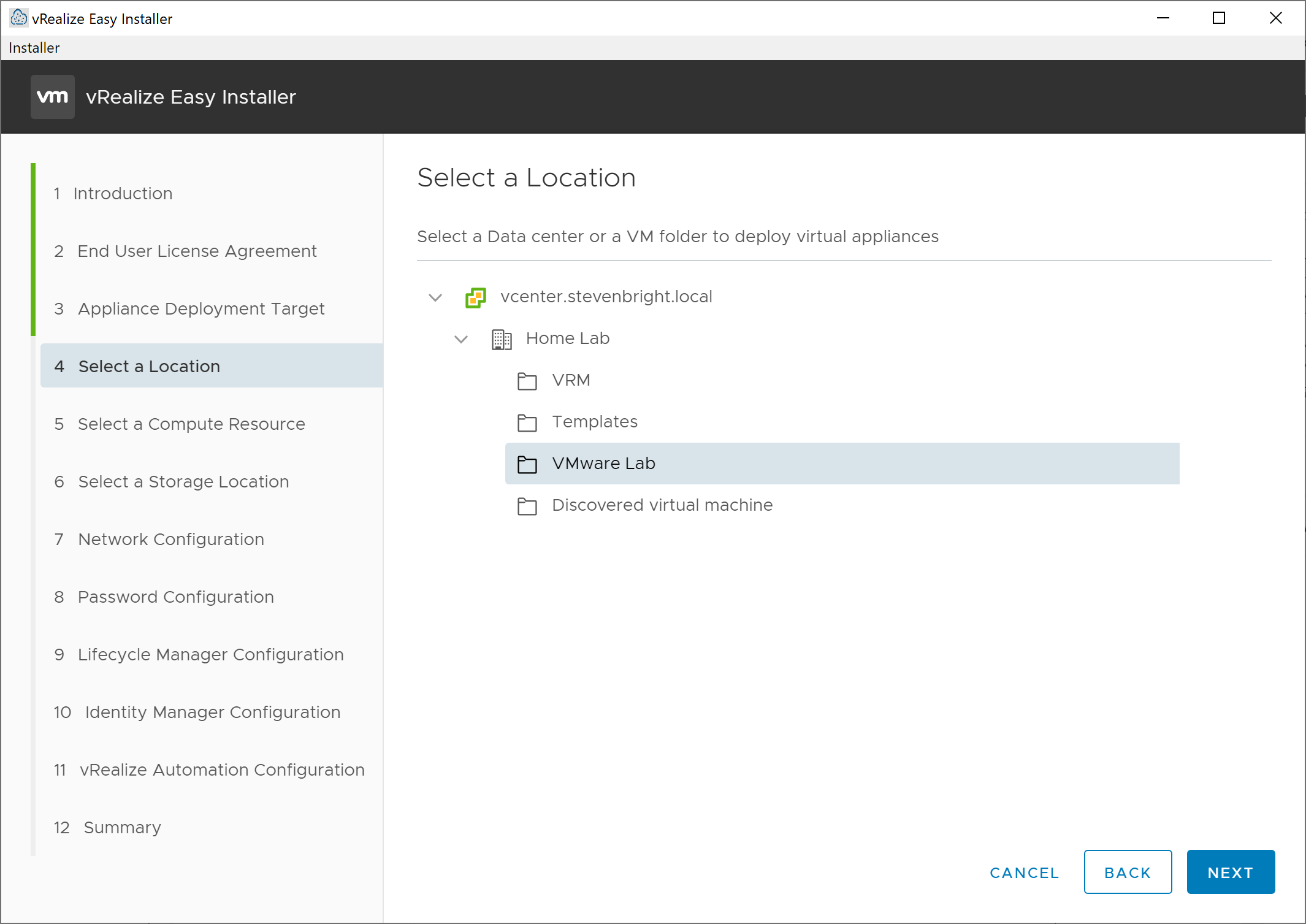 We again click the Next button to move on to the Appliance Deployment Target screen. On this screen, we provide information regarding the vCenter server where we plan to deploy the vRealize Suite Lifecycle Manager virtual appliance. You need to provide the vCenter Server’s hostname, port, username, and password, then click on the Next button. If you receive a Certificate Warning dialog box asking that you confirm the SHA1 thumbprint of the SSL certificate provided by your vCenter server, do so and click Accept to continue. After the installer validates your credentials, you are presented with the Select a Location screen.