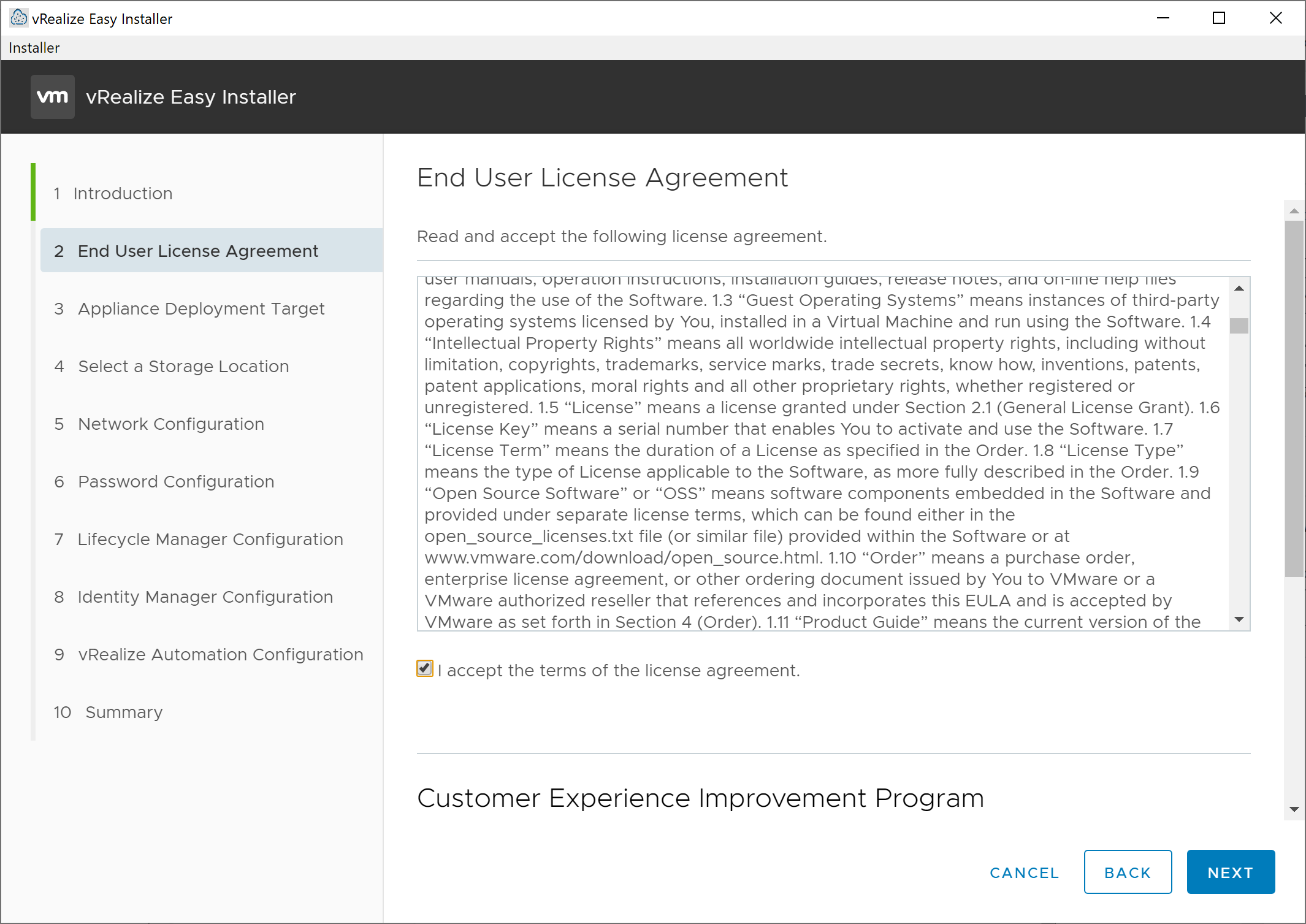 We click Next to move on to the End User License Agreement screen where we accept the license agreement and specify yes or no to participating in the Customer Experience Improvement Program.