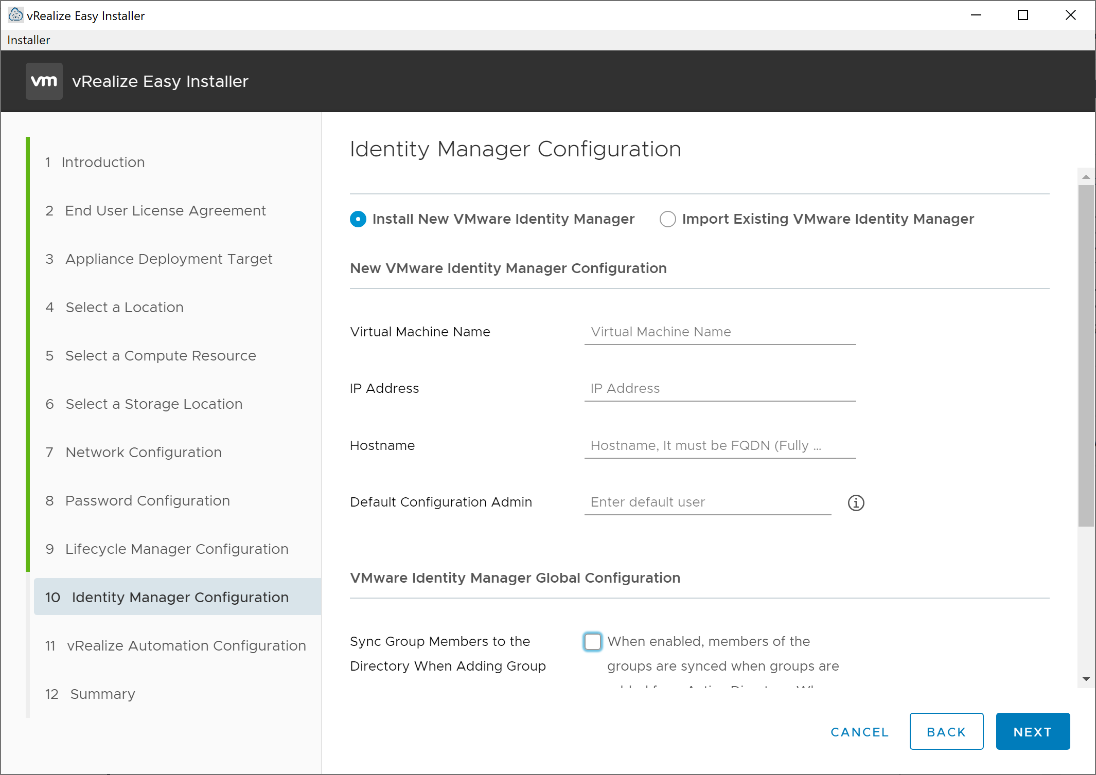 On the resulting Identity Manager Configuration screen, we are provided the option to deploy a new instance of VMware Identity Manager or to import an existing instance. If you will deploy a new instance, provide virtual machine name, IP address, hostname (provide FQDN), a default username that vRealize Suite Lifecycle Manager will utilize as a configuration user (this is the user account you will use to access vRealize Automation the first time), as well select whether or not VMware Identity Manager should sync Active Directory security group members to VMware Identity Manager or only the group itself.