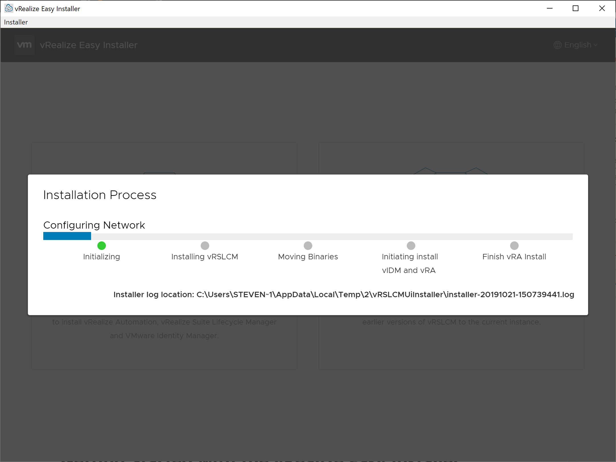 After initiating the installation process, you are provided a screen with the status of the installation process as well as the path to the log file. Each step of the process and the current status of each step are listed.