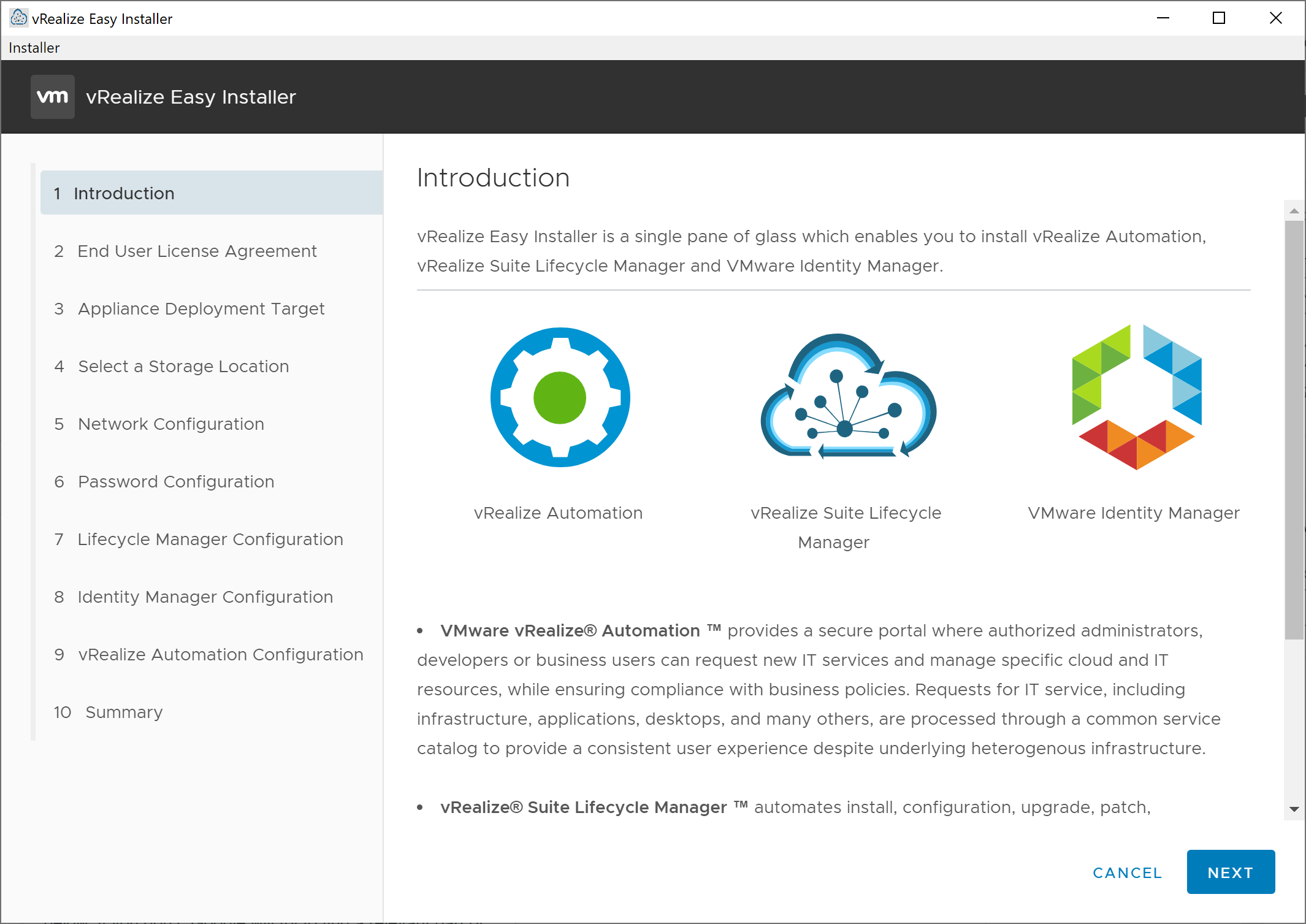 vRealize Automation 8.0 is a dramatic departure from the processes of deploying/upgrading (upgrades aren’t supported, only migrations are supported) that we used for previous releases. Starting with version 8.0, the only supported method for deploying a vRealize Automation 8.0 environment is to utilize vRealize Lifecycle Manager 8.0. While previous versions of vRealize Lifecycle Manager required you to go through the manual process of deploying and setting up the vRealize Lifecycle Manager virtual appliance, this new release has what VMware calls the “vRealize Easy Installer” which is an executable wizard that handles the deployment and configuration from start to finish for vRealize Lifecycle Manager 8.0, vRealize Automation 8.0, and VMware Identity Manager 3.3.1.