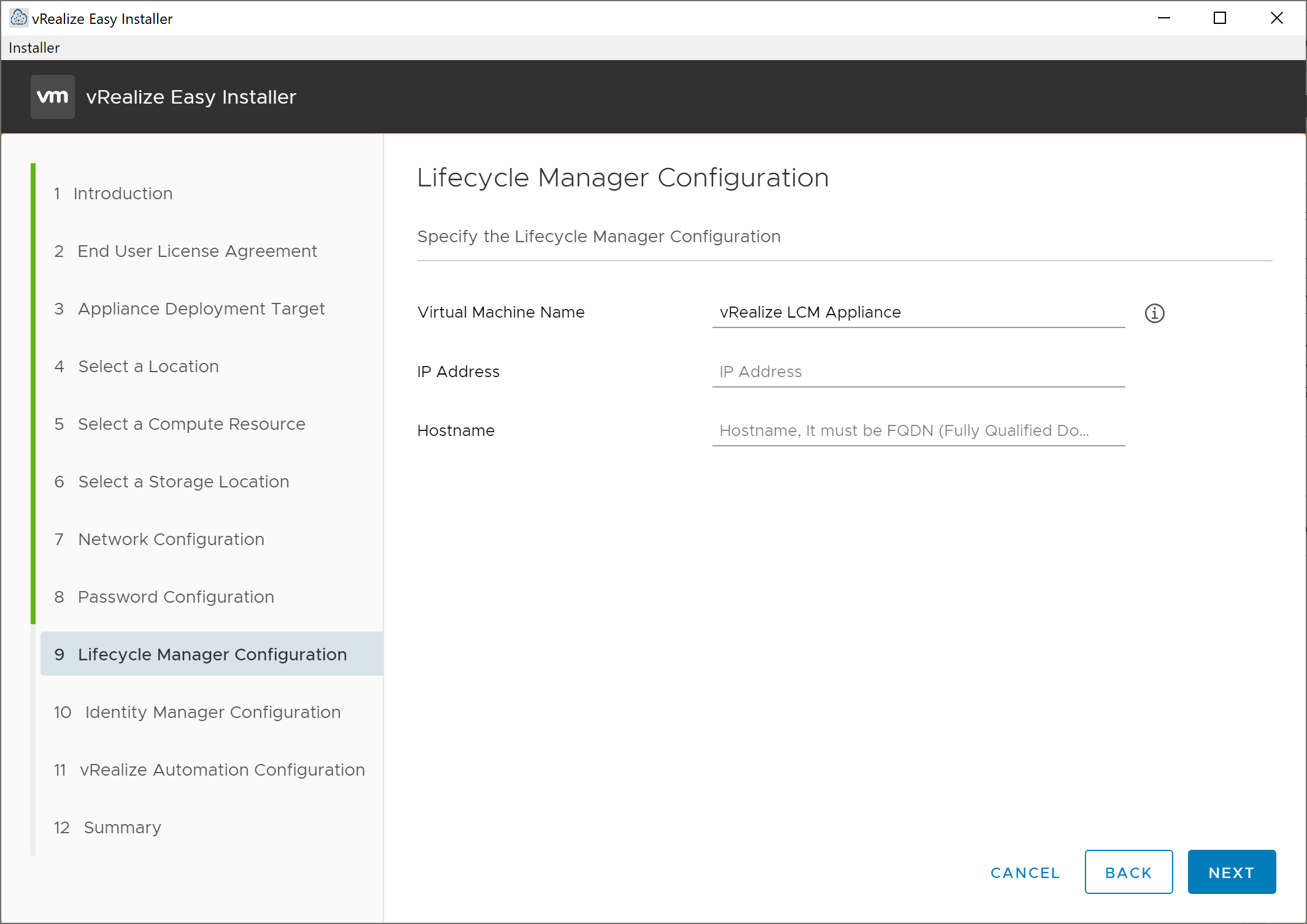 On the resulting Lifecycle Manager Configuration screen, enter the name for the new vRealize Suite Lifecycle Manager Appliance, as well as the desired hostname (enter the FQDN) and IP address. Click Next to continue to the Identity Manager Configuration screen.
