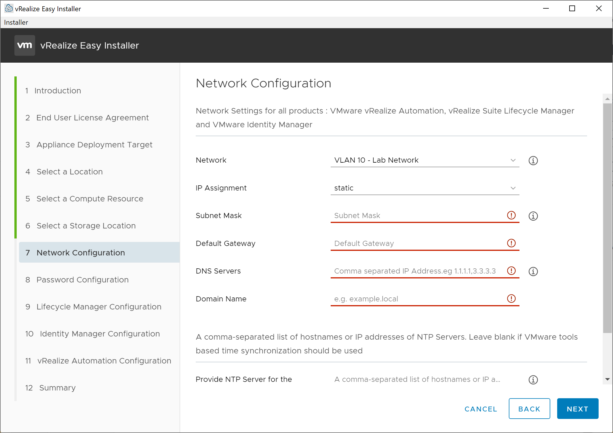 On the resulting Network Configuration screen, select the network, IP address assignment mode (static appears to be the only option at this time), and enter the subnet mask, default gateway, DNS servers, and domain name for the new virtual appliance. Additionally, provide one or more NTP servers in a comma-separated list. At this point, we won’t be providing an IP address or hostname for the appliance as these network settings are used during the deployment of the virtual appliances for all three applications. Click Next to move on to the Password Configuration screen.
