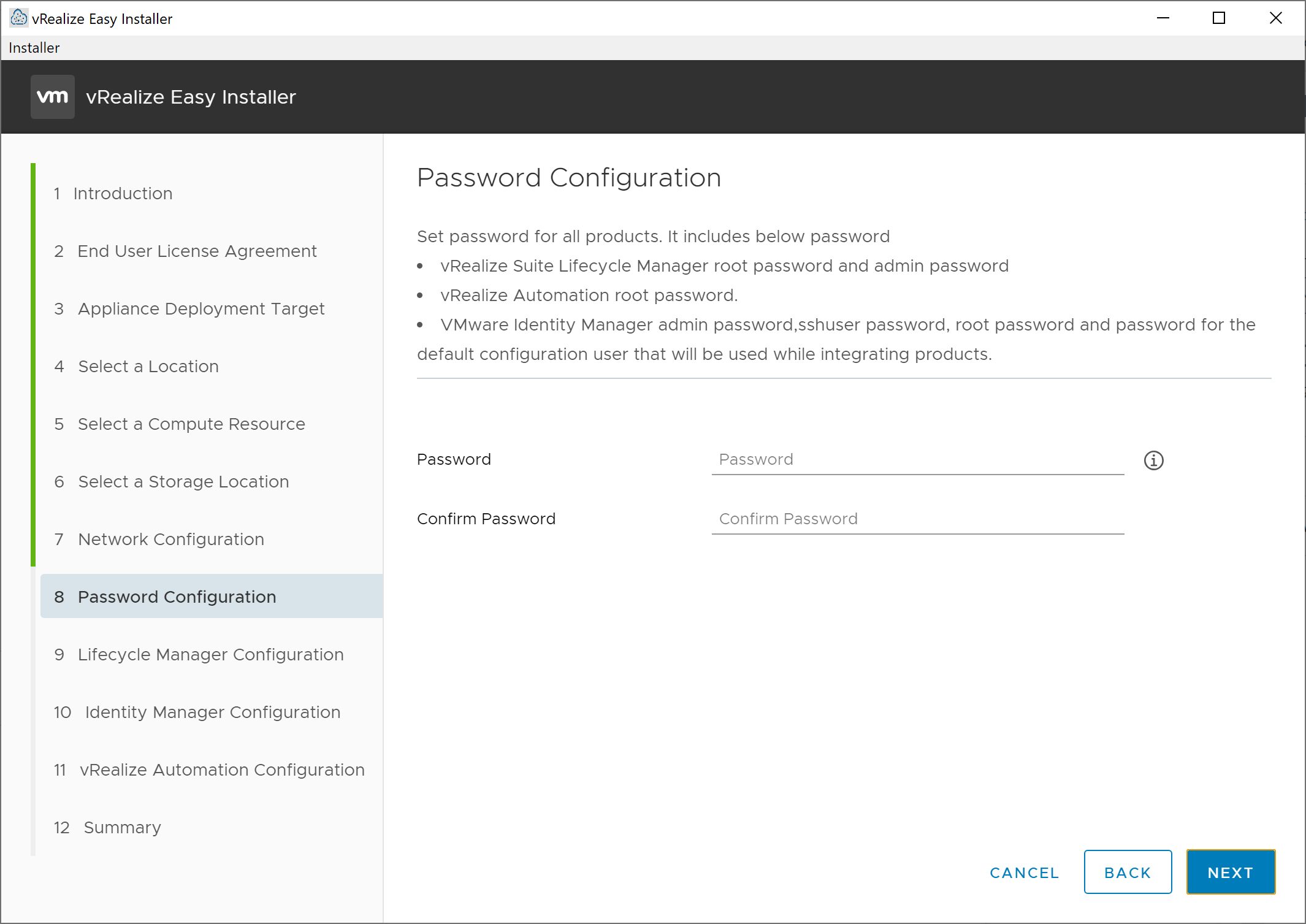 On the resulting Password Configuration screen, enter the password that will be utilized for the root and admin account on the vRealize Suite Lifecycle Manager and Identity Manager appliances, then click Next.
