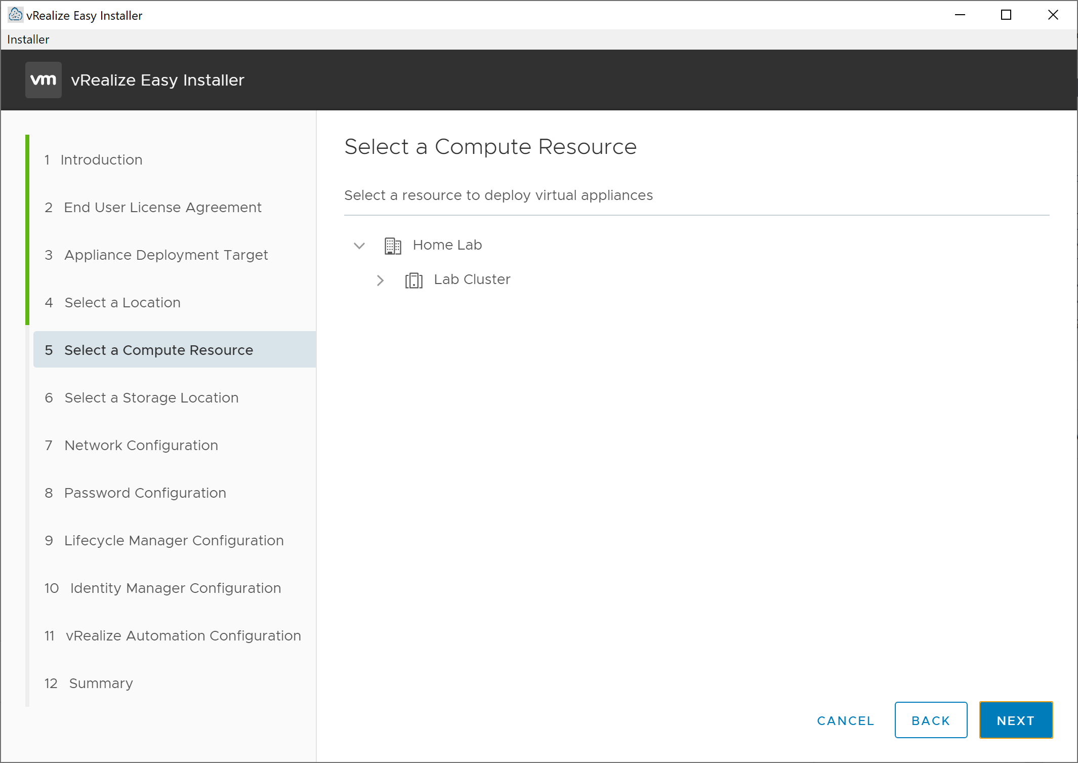 The next screen presented is the Select a Compute Resources screen. From here, select the cluster or host where we would like to deploy the new virtual appliance. Once you have selected the desired resource, click Next to move on to the Select a Storage Location screen.