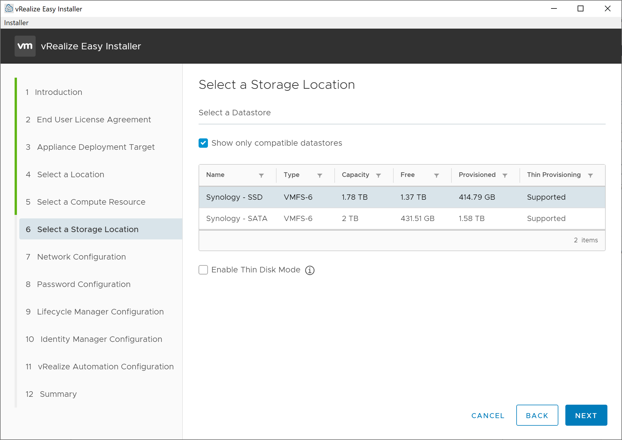 On the Select a Storage Location screen, select the storage location for the new virtual appliance. If desired, select the Enable Thin Disk Mode to deploy the virtual appliance storage using thin provisioning. Click Next to continue.