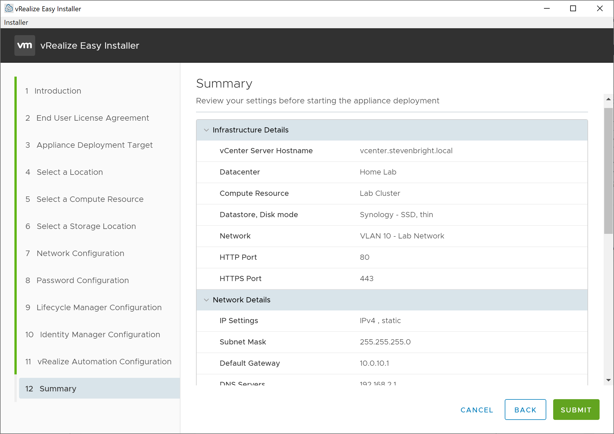 On the Summary screen, verify that all information is correct, then click Submit to initiate the deployment of vRealize Suite Lifecycle Manager, VMware Identity Manager (if you opted for a new deployment of vIDM) and vRealize Automation.
