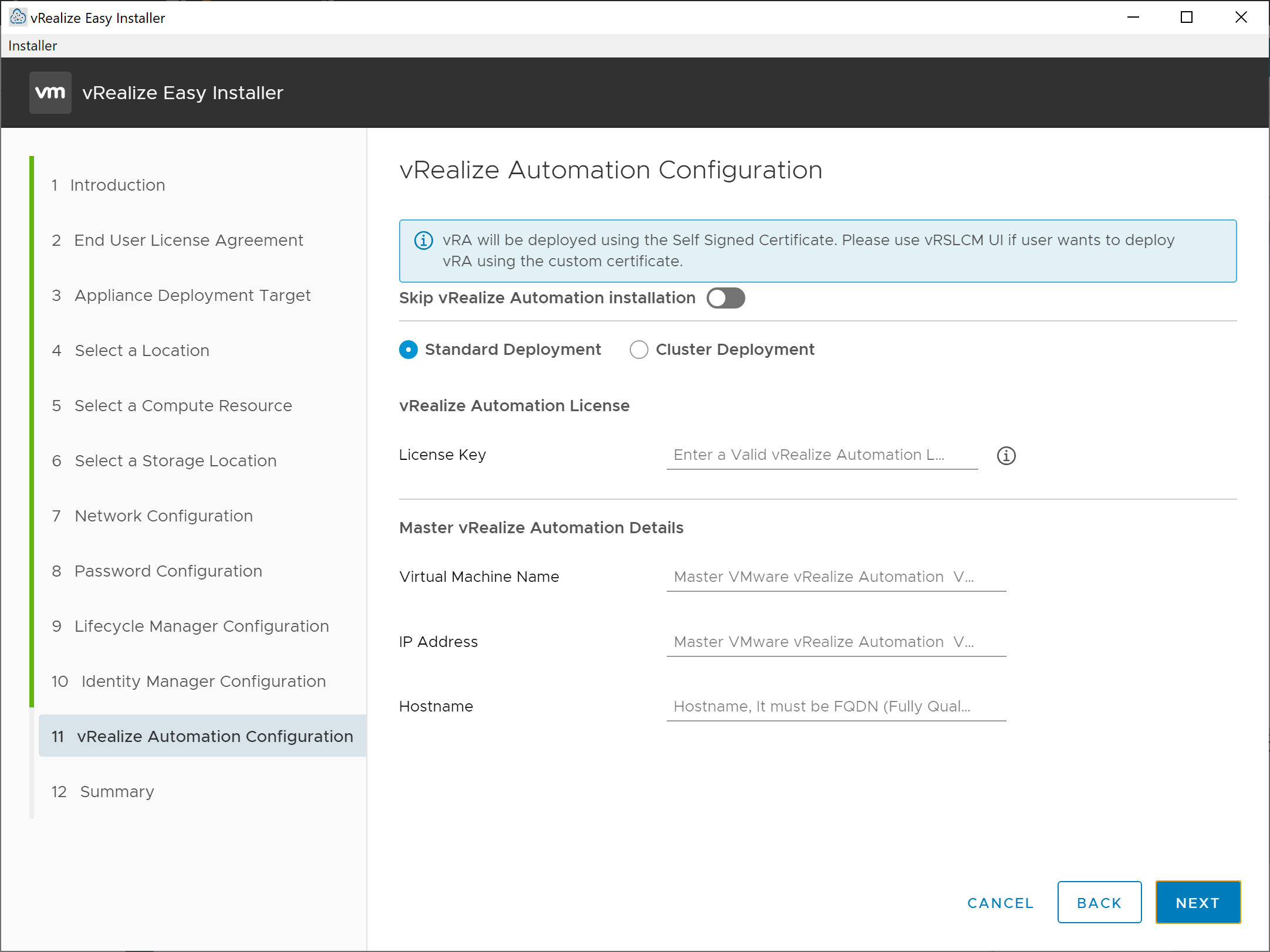 On the vRealize Automation Configuration screen, select whether you wish to deploy a Standard or Clustered deployment (we’ll select Standard for this walkthrough). Enter your vRealize Automation or vRealize Suite license key, a name for the vRealize Automation virtual machine, as well as the IP address and hostname for the VM. Click the Next button to move to the Summary screen.