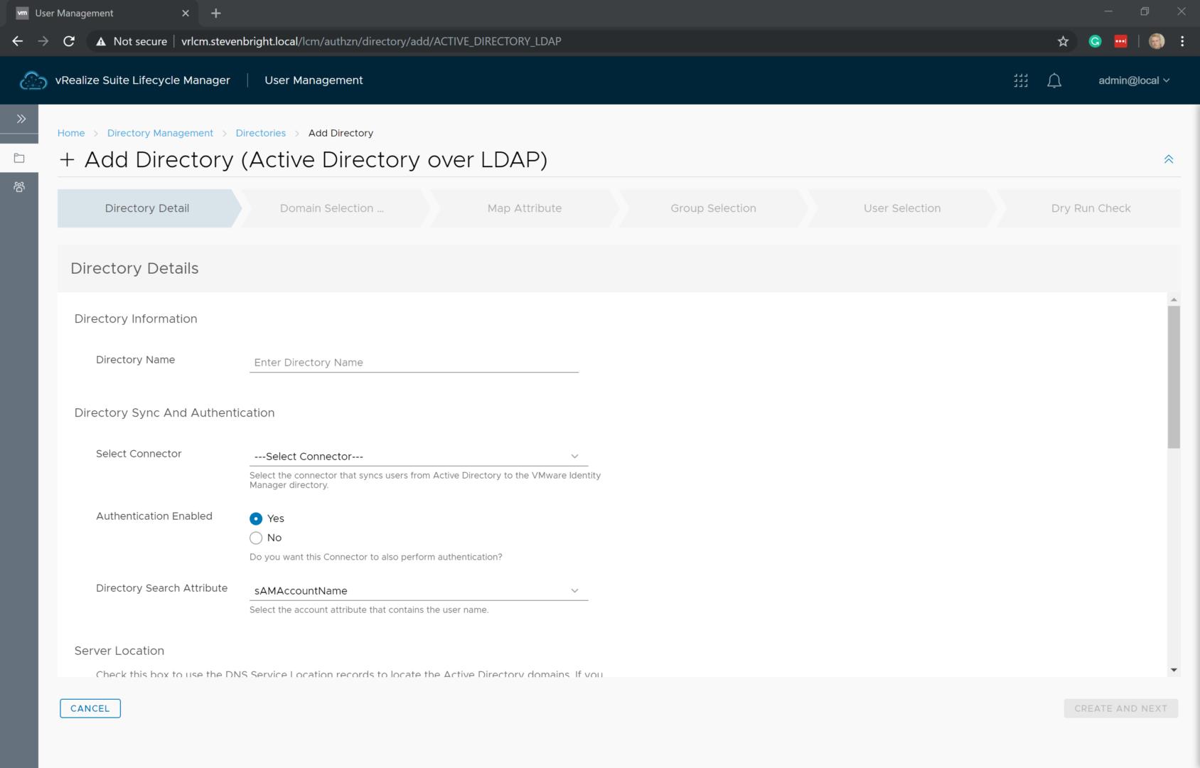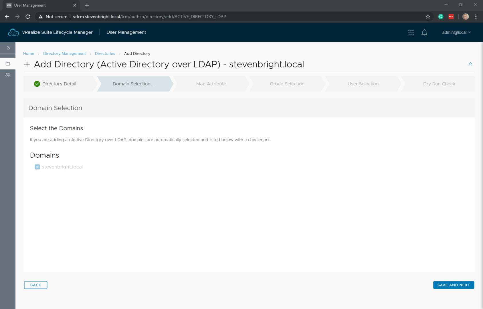 For this walkthrough, I’ll select Active Directory over LDAP. This loads a wizard for adding the directory to vRealize Suite Lifecycle Manager. Fill in in all of the required details, then click the Create and Next button to move to the Domain Selection portion of the wizard.
