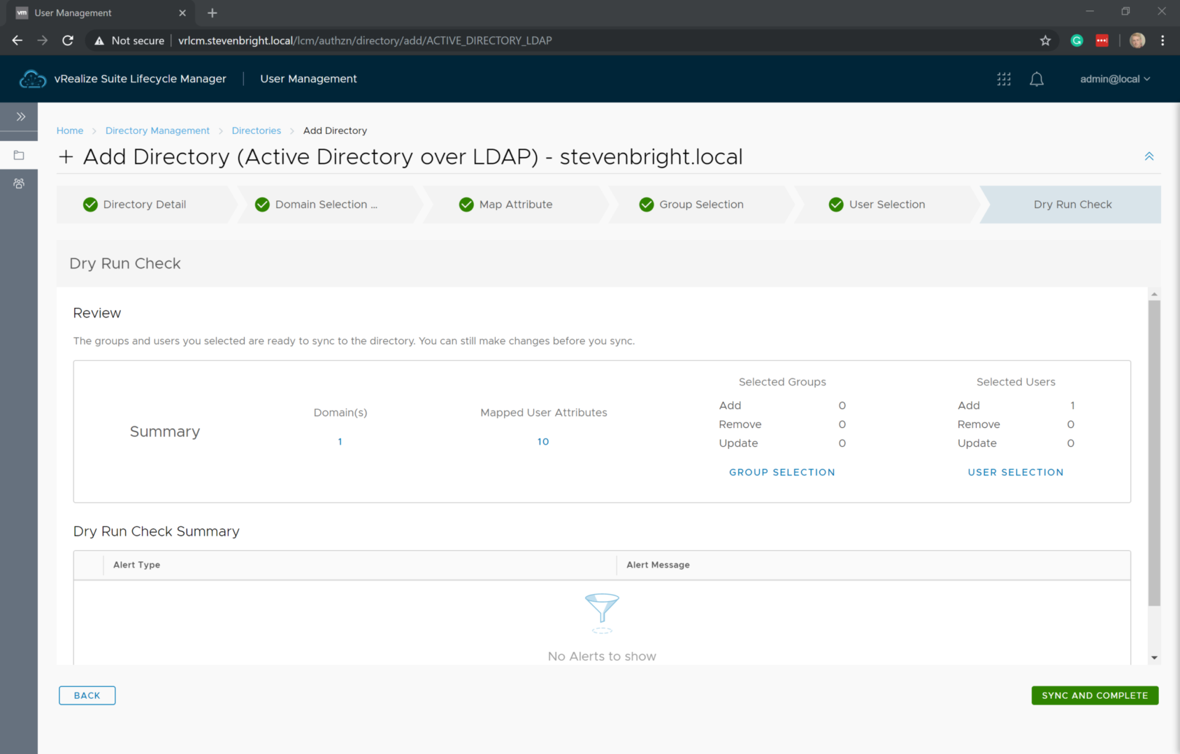 When the Dry Run Check portion of the wizard loads, it will automatically initiate a dry run check of your configuration. Any issues found with your configuration are provided to you at this time. If everything looks good, click the Sync and Complete button to kick off the process of adding your directory and syncing your users/groups from Active Directory.
