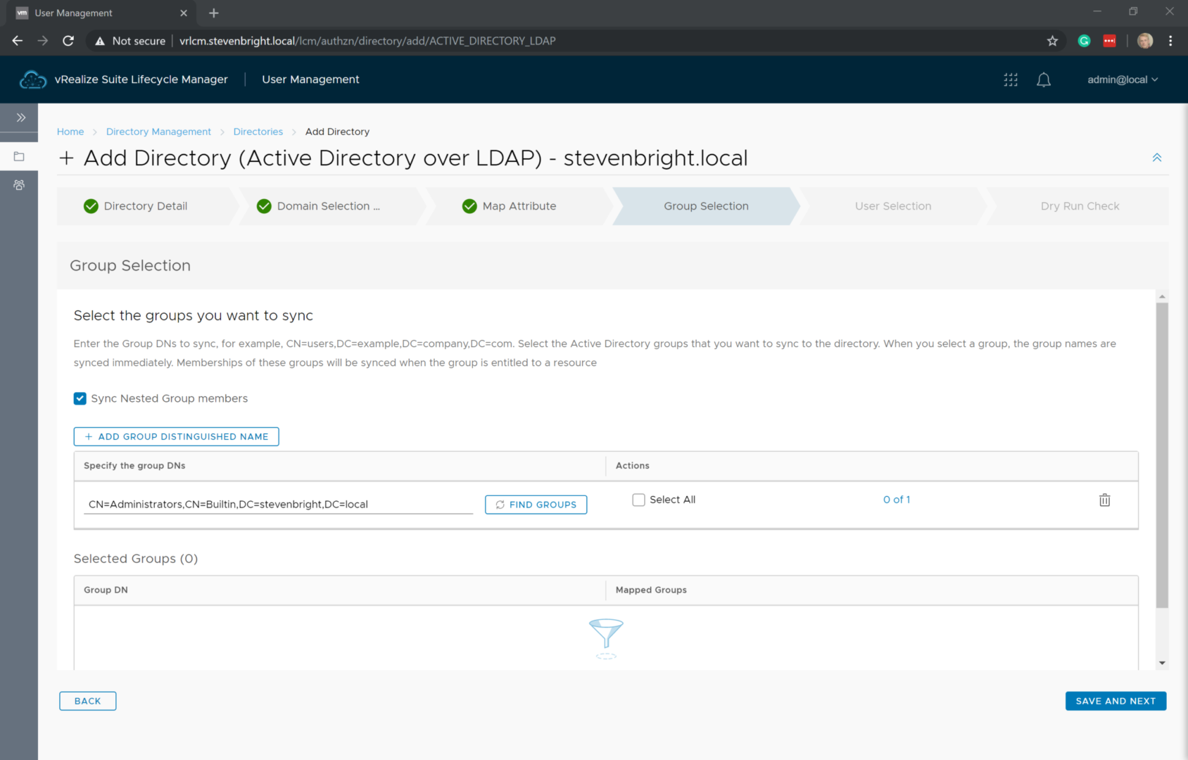Next up is the Group Selection portion of the wizard. On this screen, you add any Active Directory security groups that you wish to utilize within vRealize Automation. The groups are added by clicking the + Add Group Distinguished Name button and then providing DN of the group or OU where the security groups are stored. Once you provide the DN, click the Find Groups button to query Active Directory for any security groups that match the DN. If you wish to include all of the groups that match the DN, click the Select All checkbox to add the groups to the list to be synchronized. If you wish only to add certain groups that were found by the DN query, click on the x of x link to the right of the checkbox to load the subgroup selection screen, providing you the option to select individual groups to be added. Select the groups you wish to add, then click the Done button. After you have selected all desired security groups, click the Save and Next button to continue to the User Selection portion of the wizard.