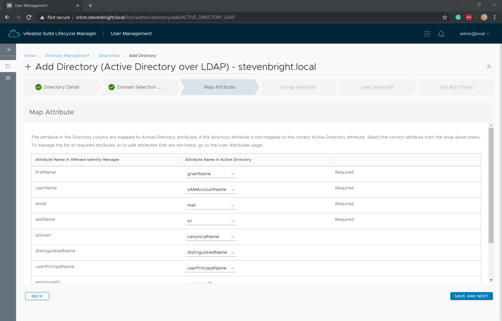 The Map Attribute portion of the wizard allows you to map information from your Active Directory to the user accounts that will be stored in VMware Identity Manager. By default, all required attribute mappings are shown on this screen. If you need to change any of the values, do so now, then click Save and Next to continue.