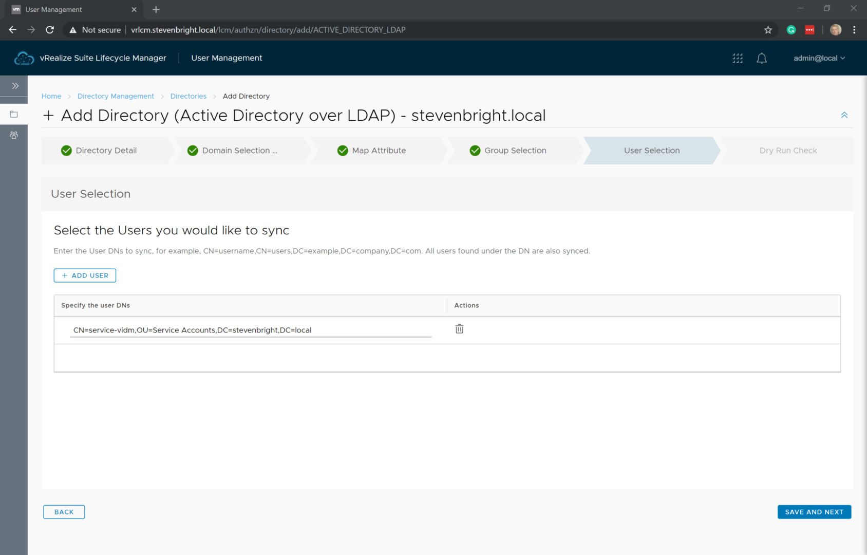 The User Selection portion of the wizard is very similar to the Group Selection portion. By default, the user account used to communicate with Active Directory is listed. If you wish to add additional users that are not already part of the security groups you selected, click the + Add User button and provide the DN for the user account. When you are finished adding your users, click Save and Next to move on to the Dry Run Check portion of the wizard.