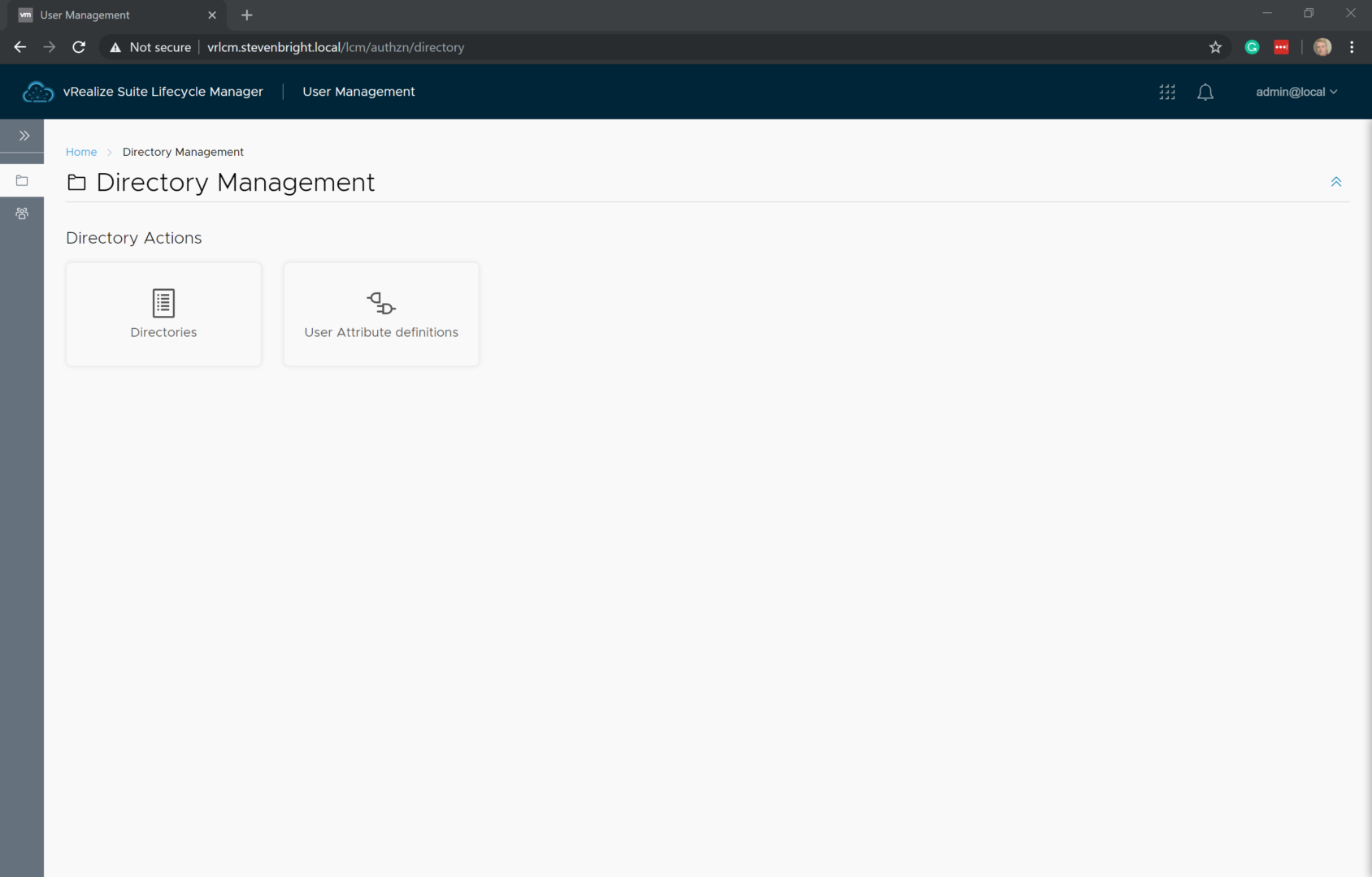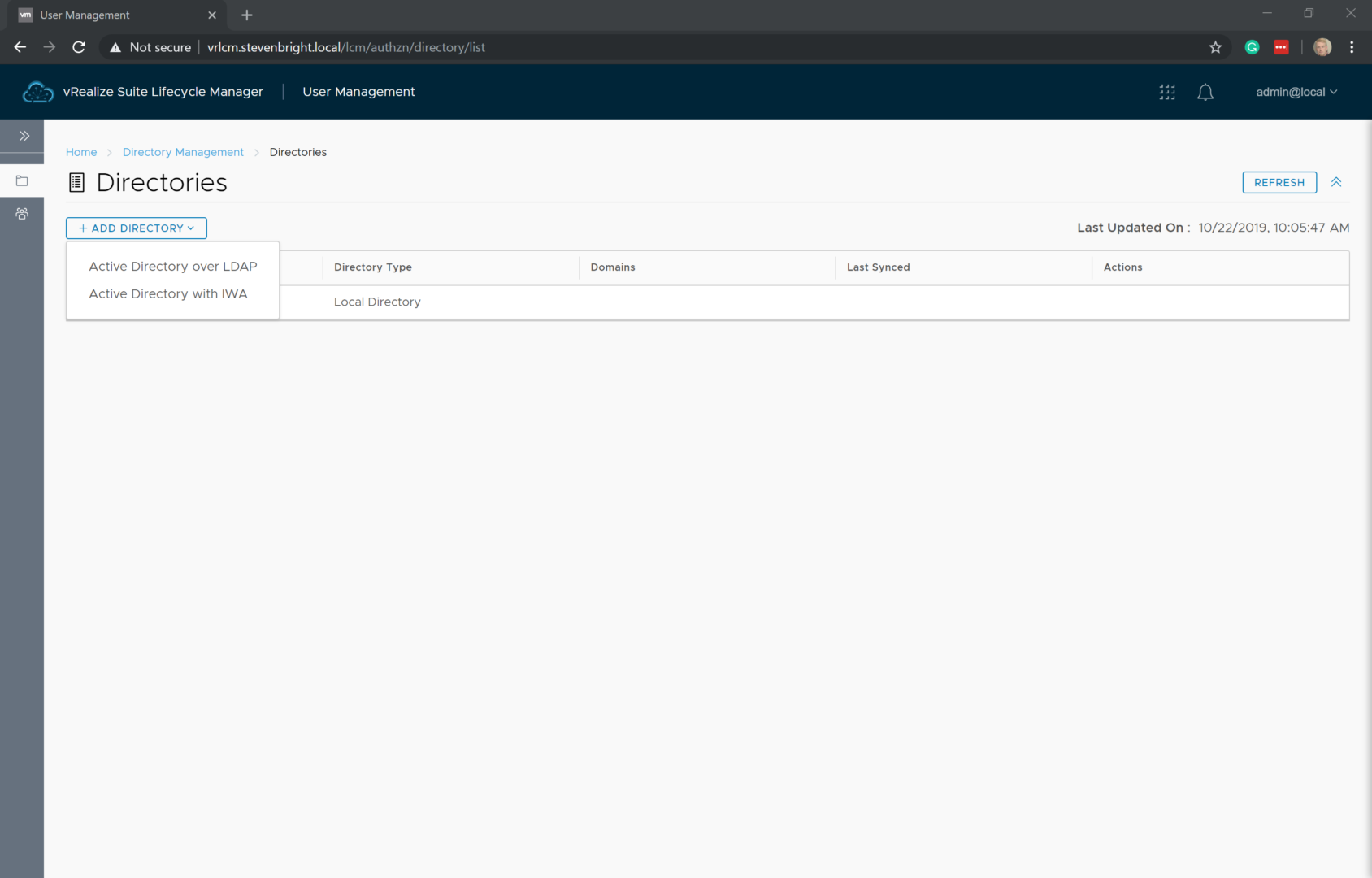 If you aren’t still logged in to vRealize Suite Lifecycle Manager, logged back in using the admin@local user account and the password that you provided to the vRealize Easy Installer. From the vRealize Suite Lifecycle Manager Dashboard, click on the User Management icon. This loads the Directory Management portion of the vRealize Suite Lifecycle Manager.