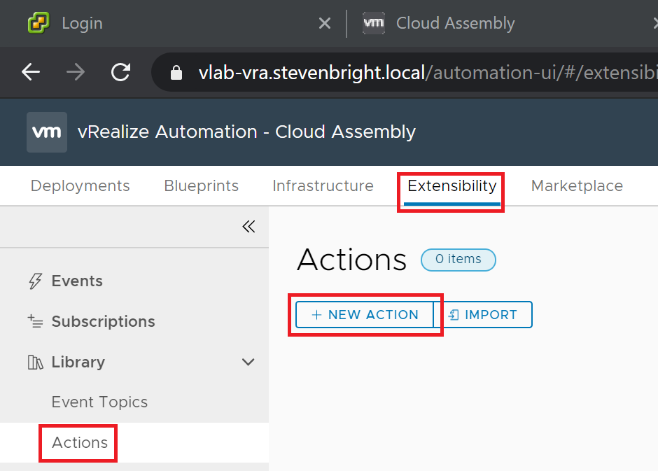 Our first step is to create our ABX action. To accomplish this, in vRealize Automation 8 Cloud Assembly, select Extensibility from the top of the page, then select Actions from the left side under the Library section. Next, click the + NEW ACTION button to begin creating our new action.