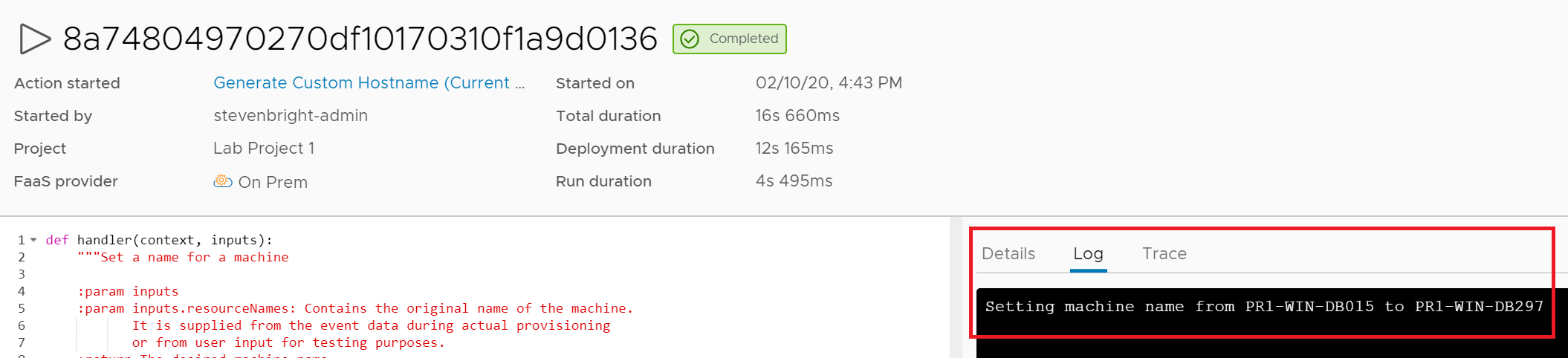 On the right side of the screen, select the Log tab to see the log from your action’s run. It will list the original name and new name that the ABX script generated for your machine. As you can see, the original name matches the Custom Naming Template we defined earlier, and the new name matches the name generated by the ABX script.