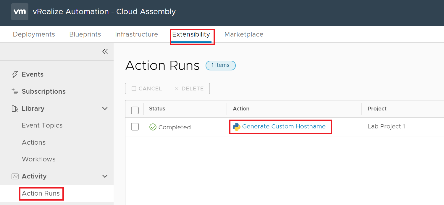 To verify that our new hostname customization event works as expected, go back and open the blueprint that you customized with the three custom properties. Click on the TEST button and fill in the required fields and click the TEST button to submit the text. Next, at the top of the screen, click on Extensibility, then select Action Runs from the left side under the Activity header. In the list of Action Runs, find the action’s run from your blueprint test. Click on the name of the action in the list to load the details of the action’s run.