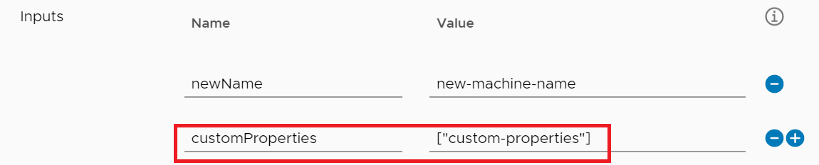 This script template assumes that our ABX function will be receiving a new VM name as part of our inputs, but since we will be generating our name, we can delete the “newName” input from our script. To do this, under the Inputs section on the ride side of the screen, click the minus sign beside the “newName” entry. Next, click the plus sign to add a new input. Use the following values for the new input: