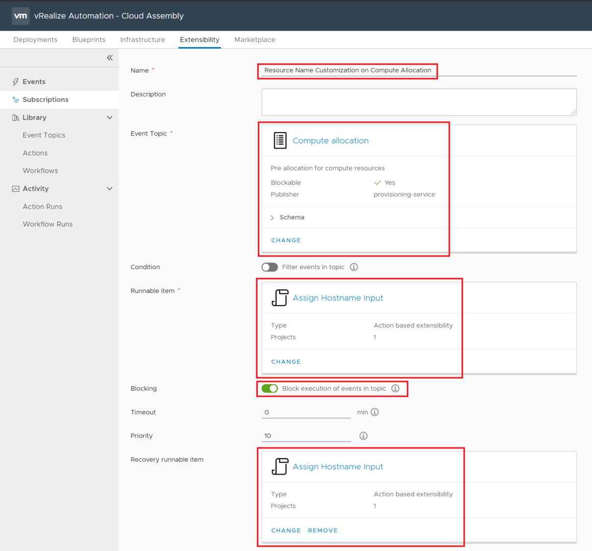 Provide a name for the subscription such as “Resource Name Customization on Compute Allocation”. For the Event Topic field, click on the + ADD button, select the “Compute allocation” event from the list of event topics, then click the SELECT button. Next, for the Runnable Item field, click the + ADD button, select the ABX action that you created, then click the SELECT button. Next, ensure that you enable the Blocking option so that Cloud Assembly won’t move forward until the new name is generated. For the Recovery runnable item, select your ABX action again. Finally, click the CREATE button to create our new event subscription.