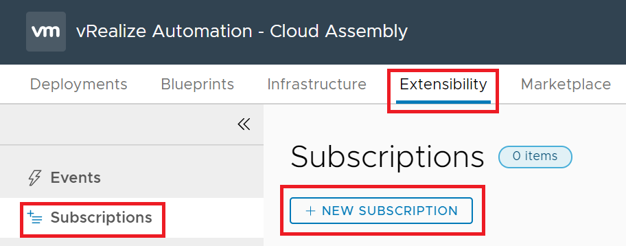 The final step in implementing our new custom ABX action is to create the event subscription that will execute our action every time a compute resource reaches the “Compute allocation” lifecycle stage. To accomplish this, within vRealize Automation 8 Cloud Assembly, click on Extensibility from the top of the screen, then select Subscriptions from the left side. Click the + NEW SUBSCRIPTION button.