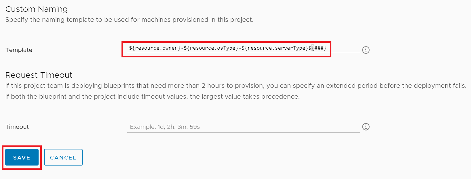 Now that we have decided on what names we will use for custom properties, we can define our Custom Naming Template on our project. When we define a naming template, we will add each variable using the text “${object.property}”. Each property is sourced from one of 6 objects: project, endpoint, resources, user, username, random digits. In our example, we use properties defined on both the project and the resources objects. Our desired naming standard would be satisfied by the following template: