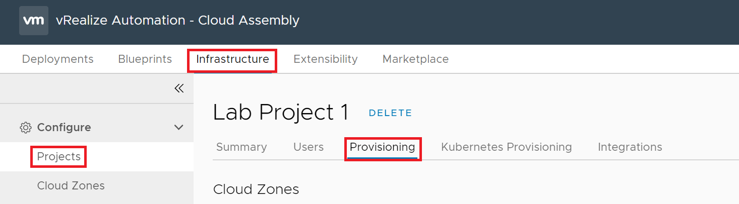 To define the template, open one of your projects within vRealize Automation 8 Cloud Assembly. Select the Infrastructure tab from the top, click Projects from the left side navigation, open the details of your project and, select the Provisioning tab.