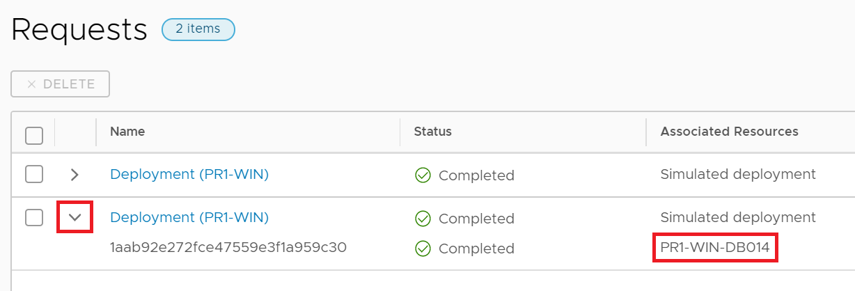 Click the Test button to verify that your deployment works successfully. Upon a successful test deployment, select the Infrastructure tab from the top of the window, then select Requests from the left side under the Activity heading. Click the arrow next to your test deployment to see the name of the resource generated by the test. If successful, you should see an object that matches the desired naming convention.